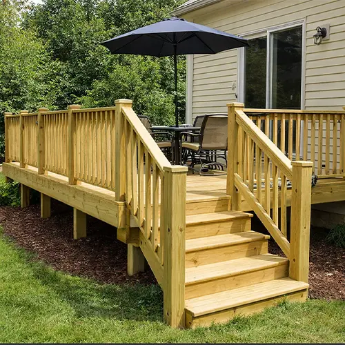 Custom-built elevated deck using pressure-treated lumber with sturdy stair access and black aluminum railings. Designed for durability, safety, and expanded outdoor living space.